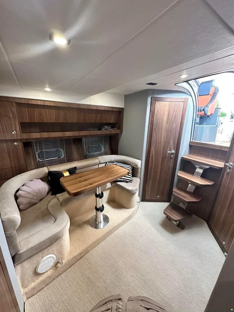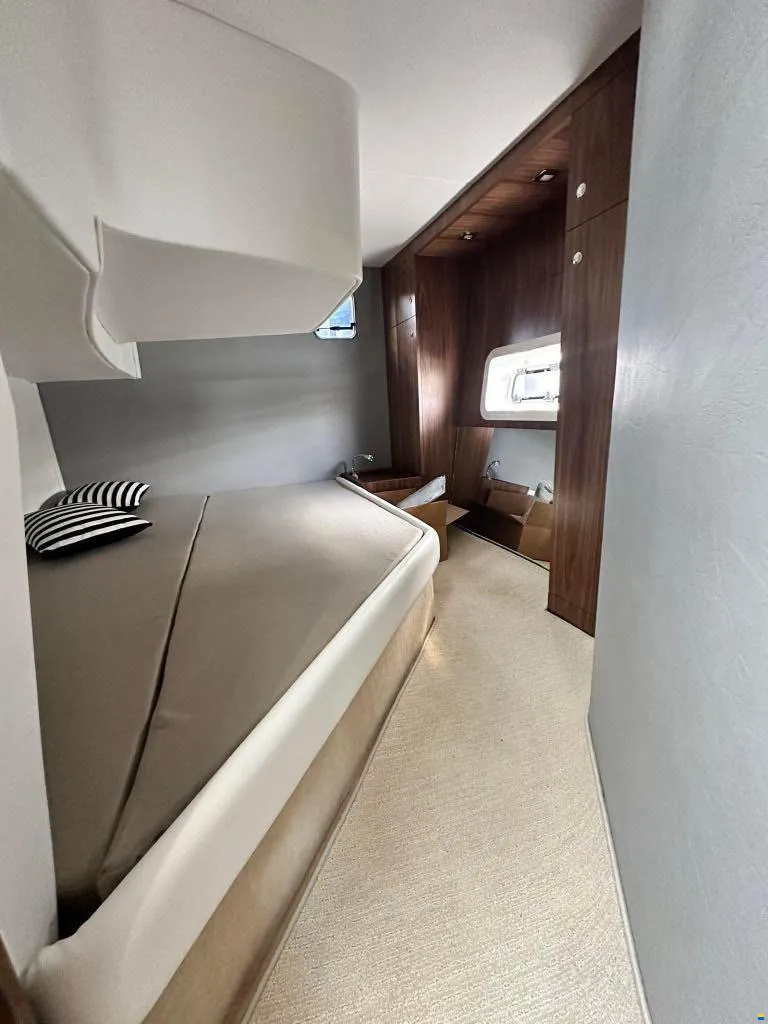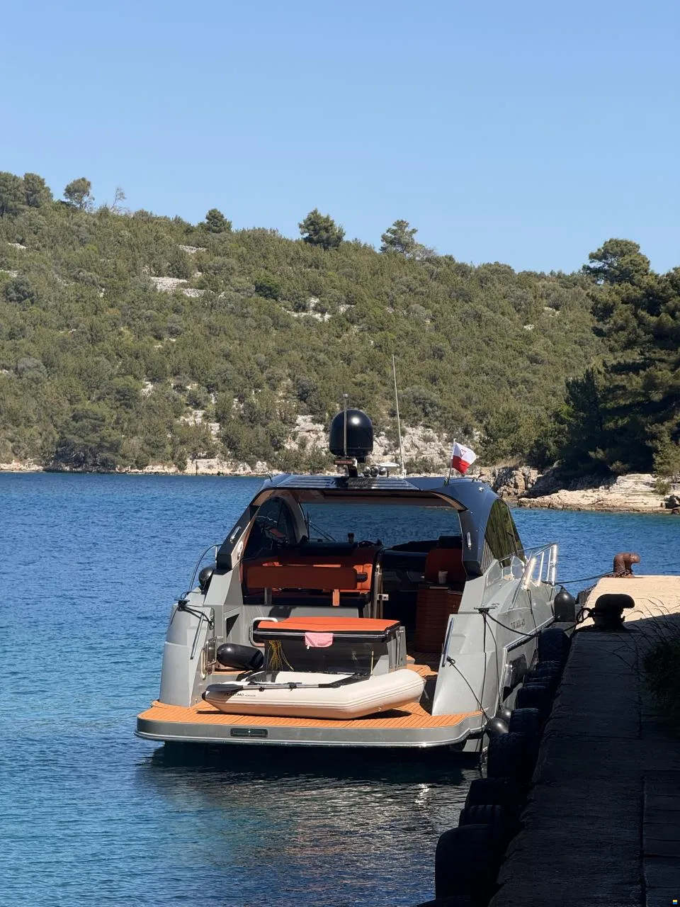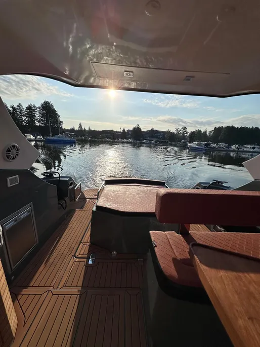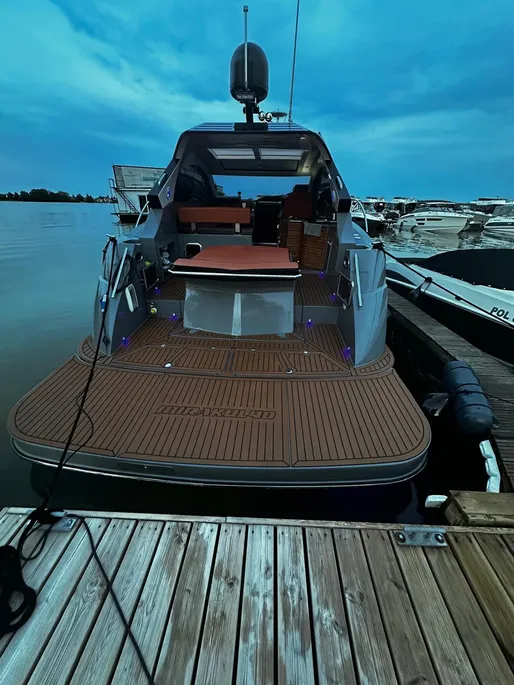 The yacht is offered with a high-spec equipment package, including: generator, air conditioning, joystick control, bow thruster, radar, teak decking in the cockpit and on the swim platform, underwater lighting, and a modern multimedia system.