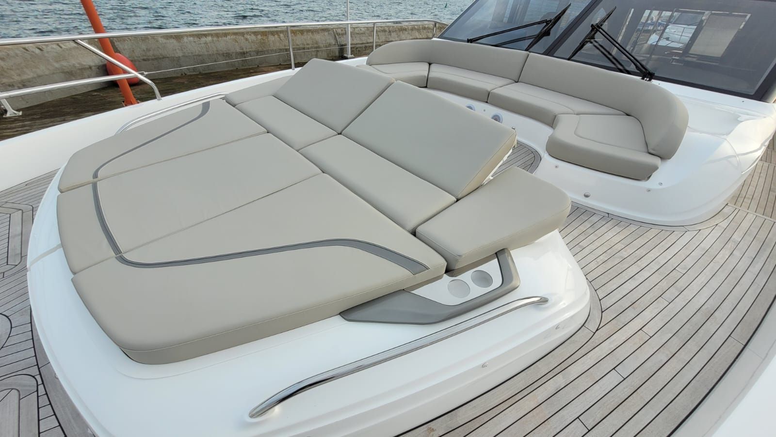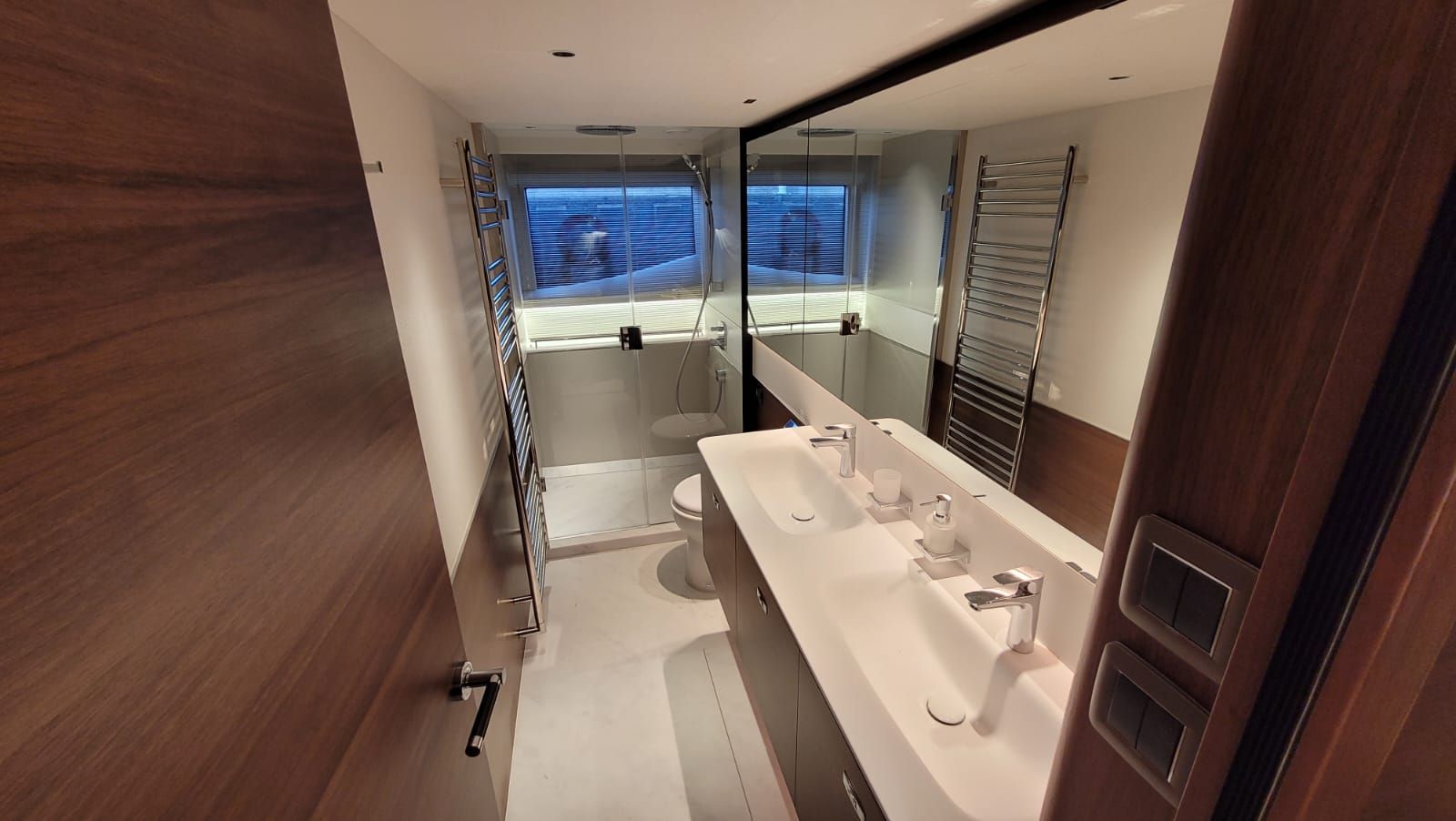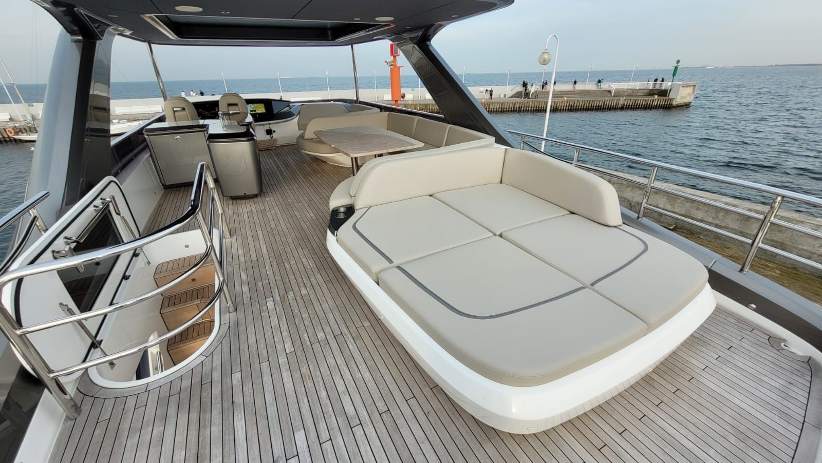 The yacht’s sleek hull lines and expansive panoramic windows flood the interior with natural light, creating a modern and exclusive character. Spacious decks and the impressive flybridge offer ideal settings for relaxation, entertaining, and enjoying breathtaking views at sea.