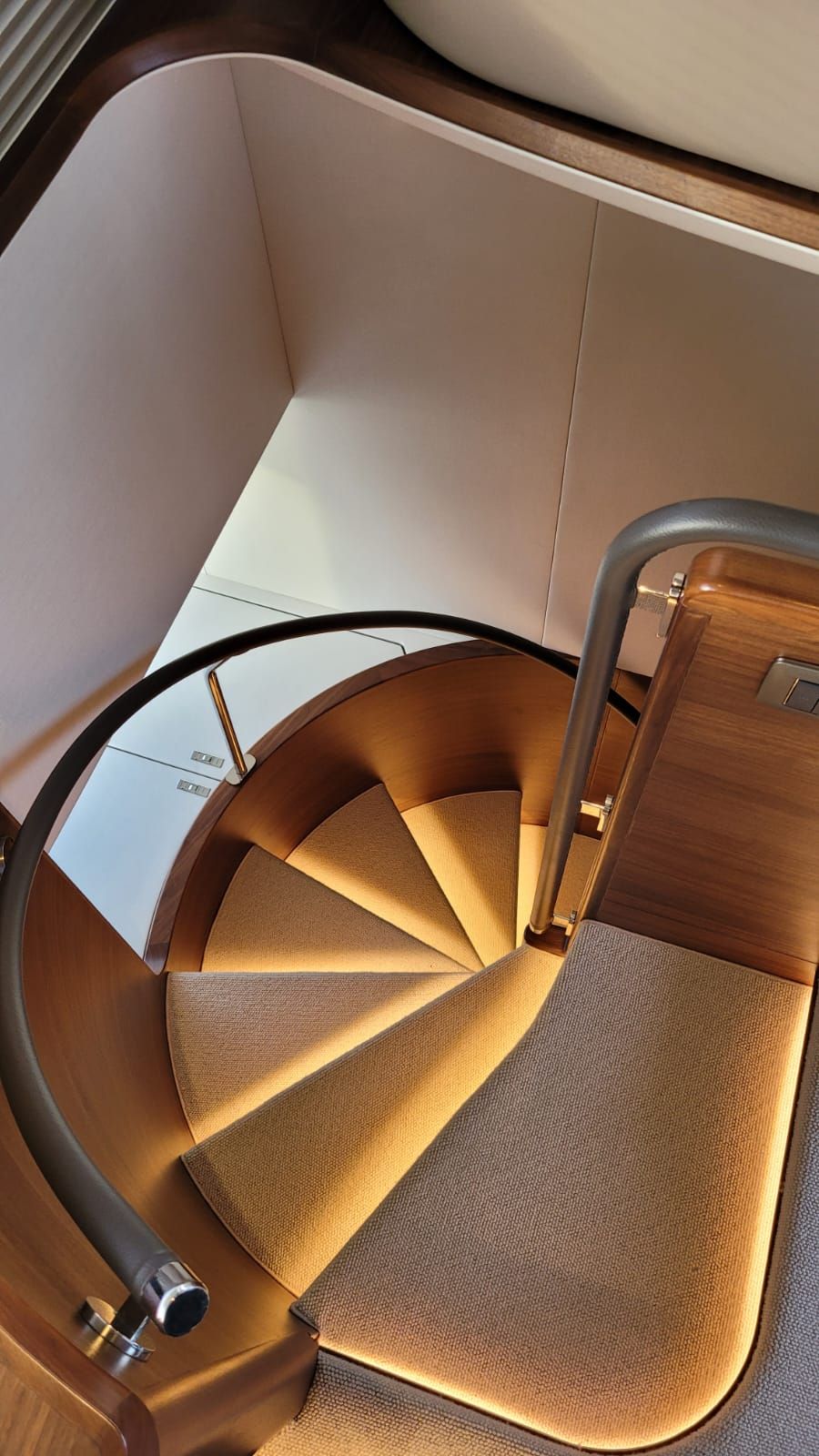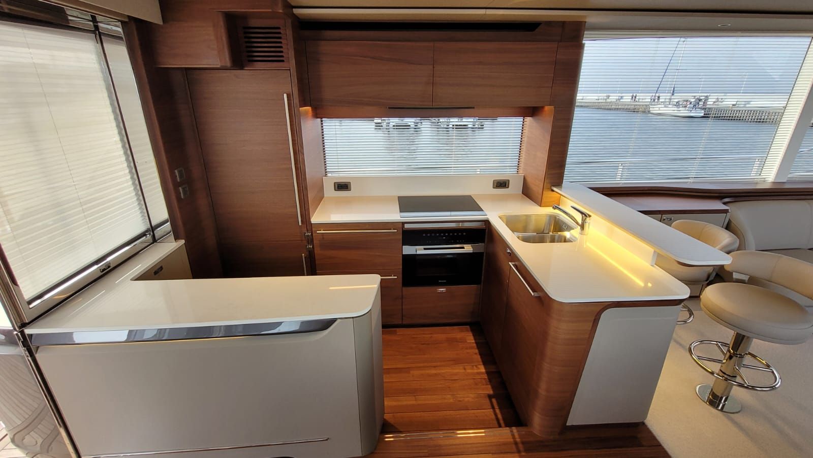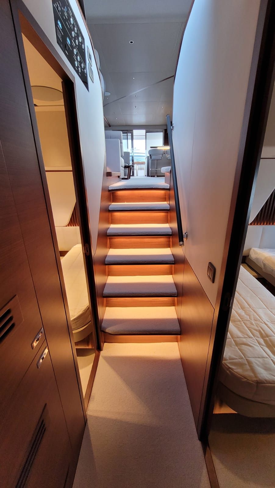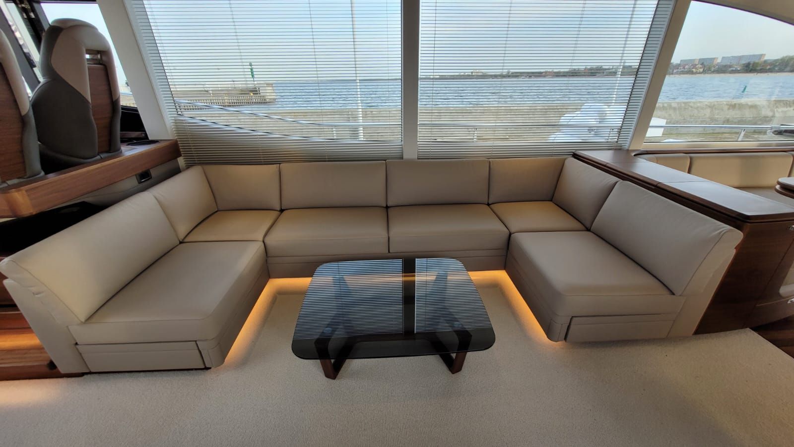 - Interior lighting package: Additional fibre optics in saloon and dining area, additional LED strips in pelmets, electric Venetian blinds on all main deck windows (except patio doors and helm station)