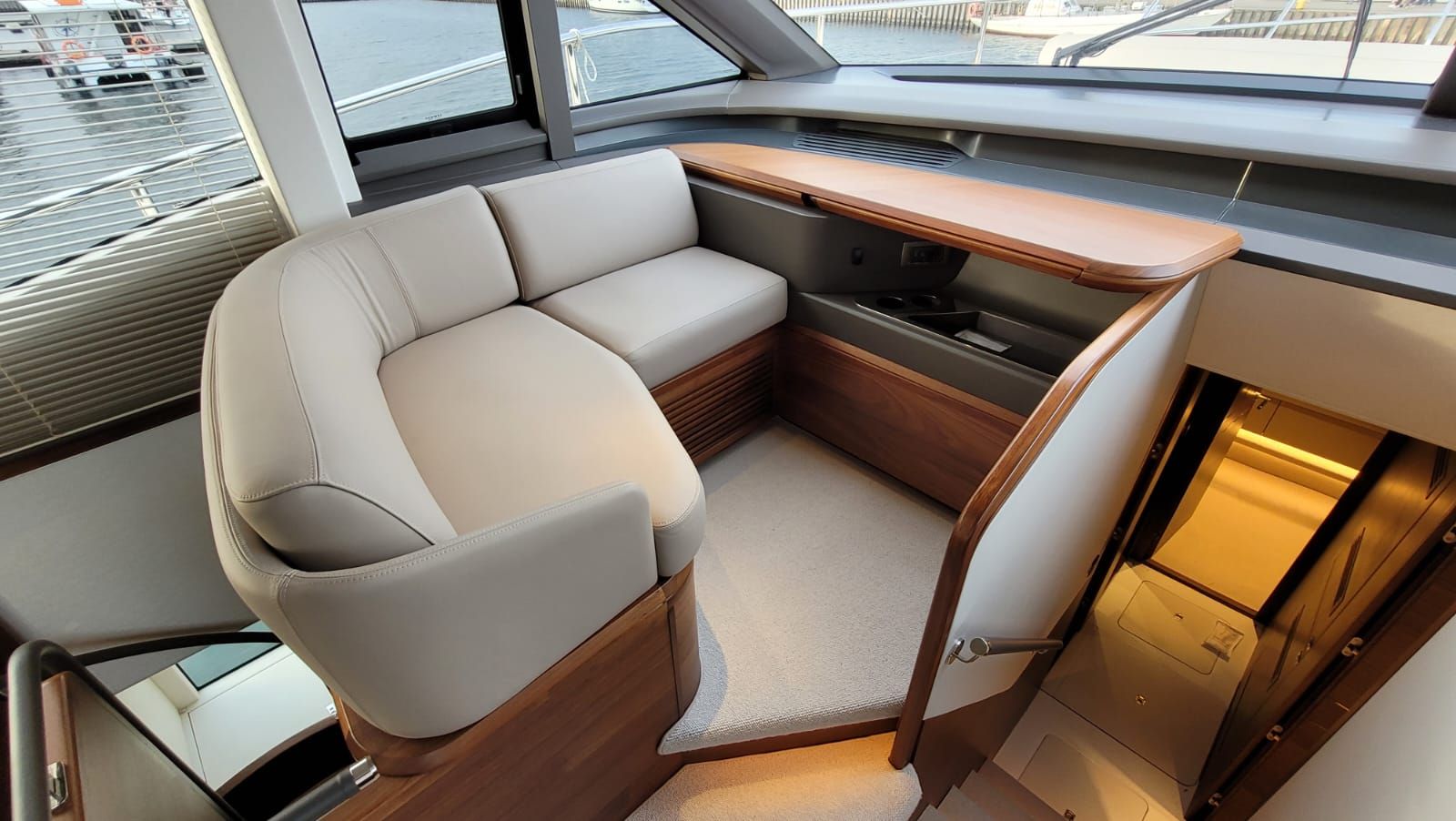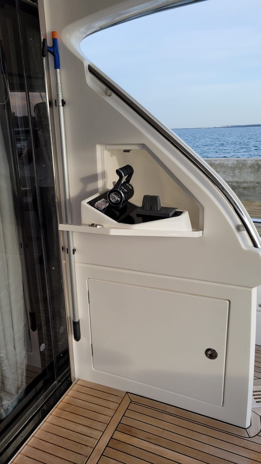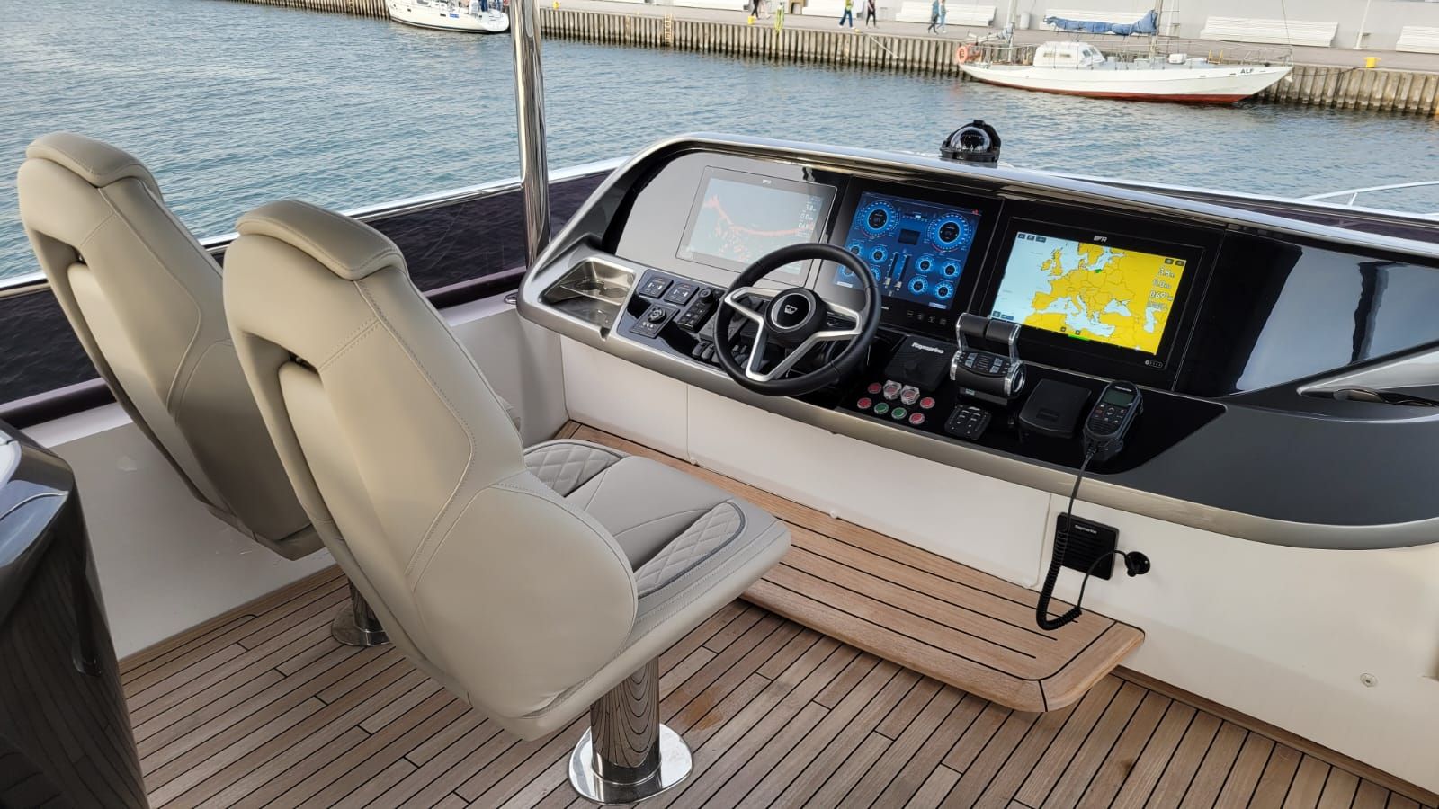- Third helm station in the cockpit (engine controls, bow and stern thrusters, and emergency engine shut-off)